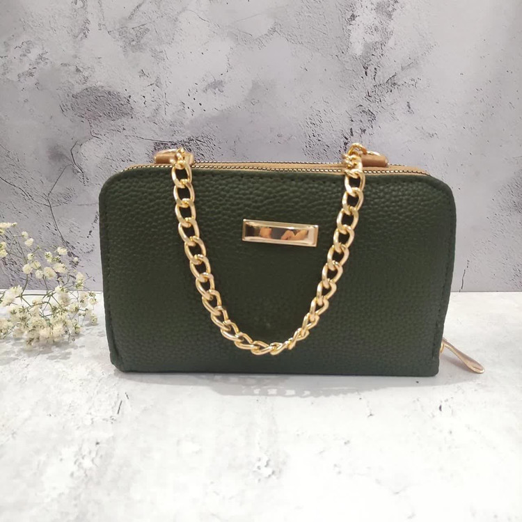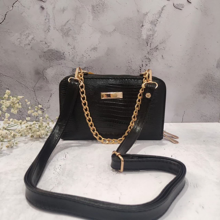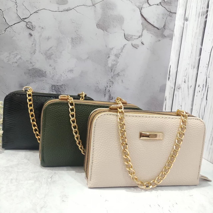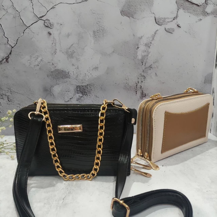 کیف زنانه چرمی دوشی و دستی دو زیپ با زنجیر طلایی دستی و بند دوشی چرمی بلند قابل تنظیم در سه رنگ جذاب