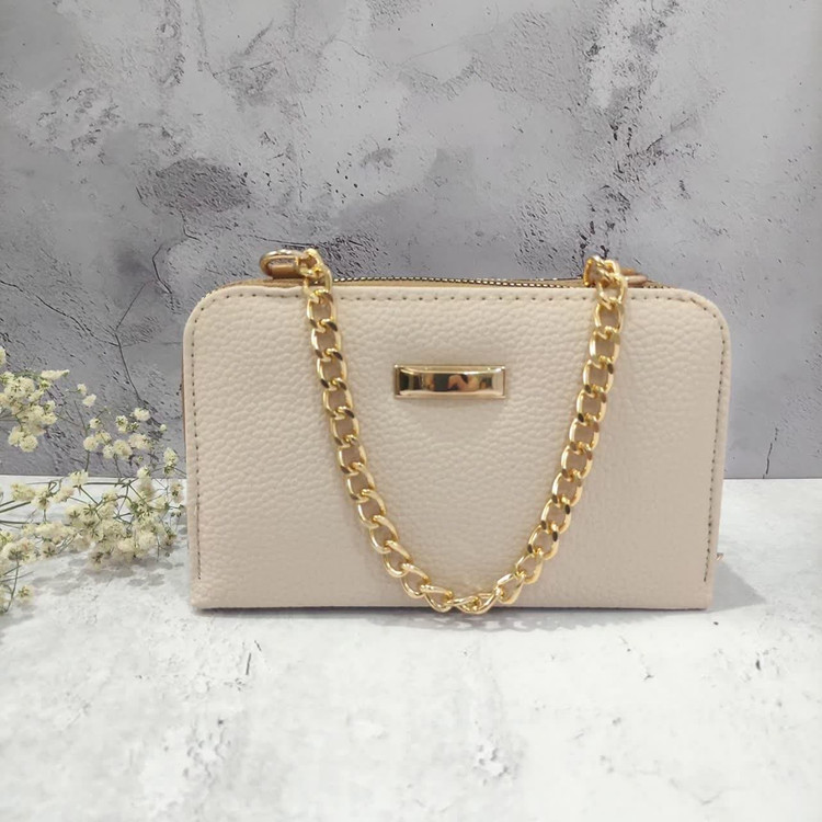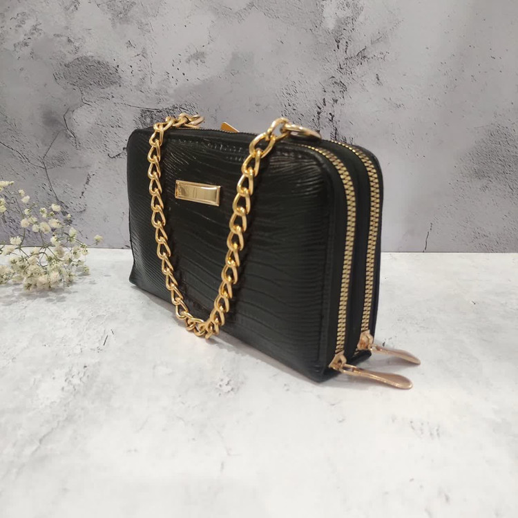جزئیات: دو زیپ روی کار و یه جیب کوچیک پشت کار و بند زنجیری طلایی دستی و بند دوشی چرمی بلند